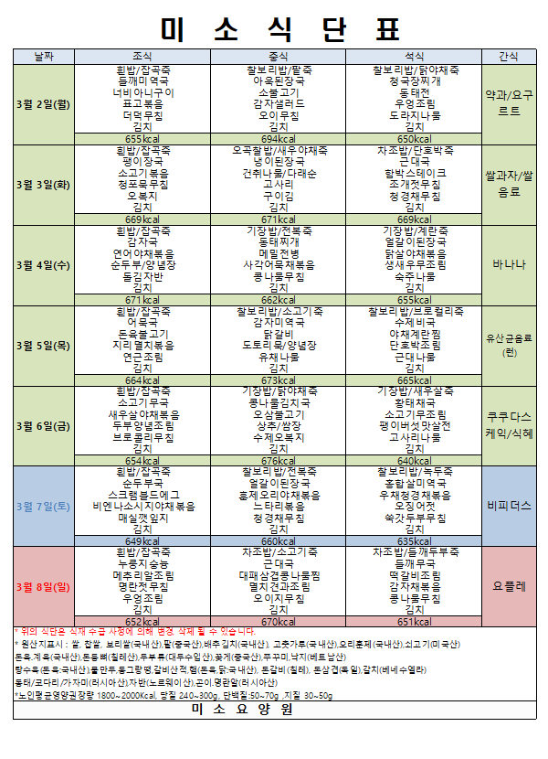 26년 3월 1주 식단표