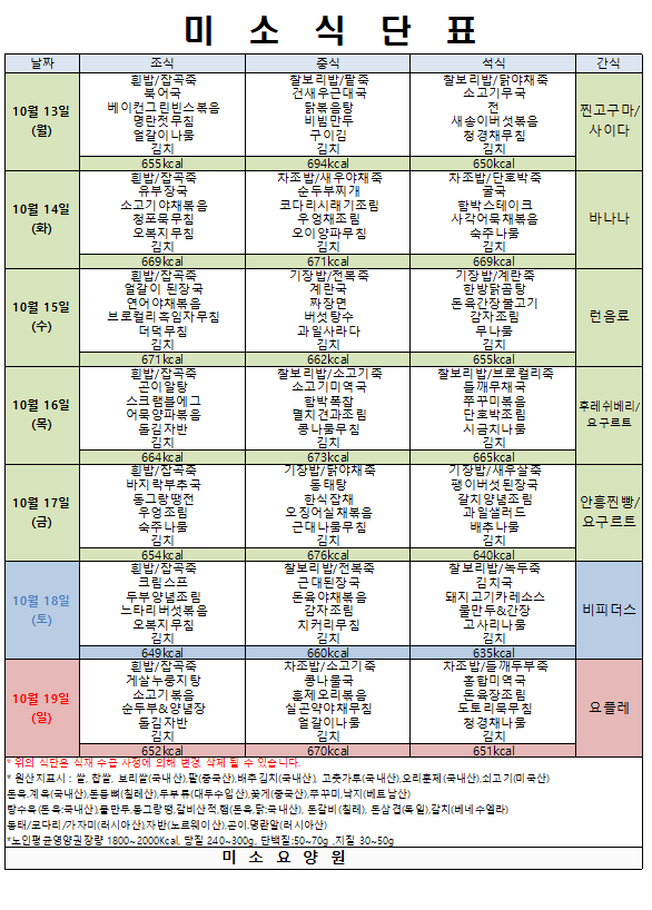 10월 3주 식단표