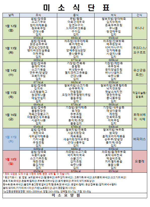 26년 1월 3주 식단표