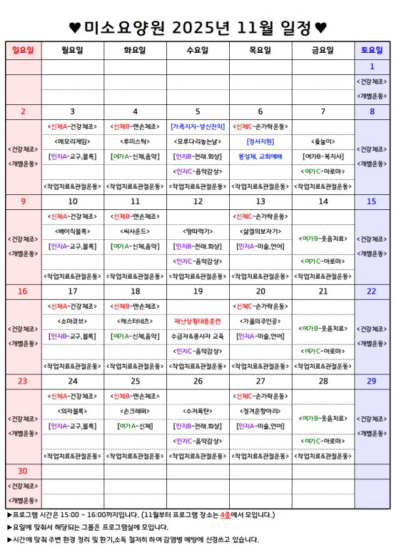 저희는 어르신들의 건강을 최우선으로 신경쓰며 원내에서 즐거운 생활을 하실 수 있도록 다양한 프로그램을 준비하도록 하겠습니다.